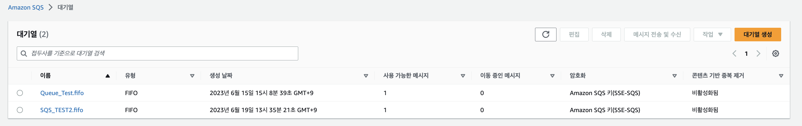 1개의 SNS에 "Queue_Test.fifo"와 "SQS_TEST2.fifo" 두개의 SQS가 구독을 했다.